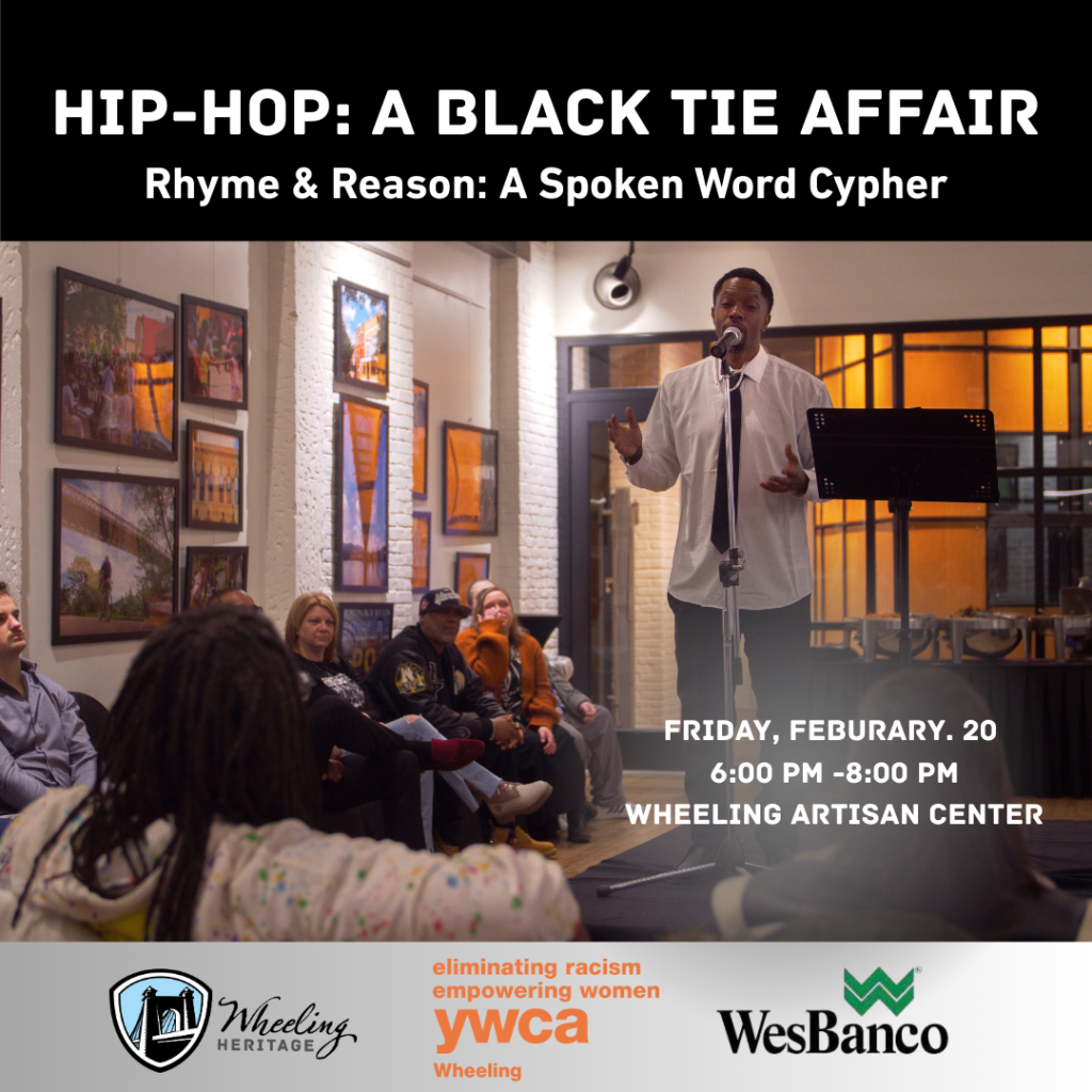 Wheeling Heritage and YWCA Wheeling present Rhyme & Reason: A Spoken Word Cypher as part of Hip-Hop: A Black Tie Affair. This spoken word and hip-hop event features multiple artists, along with Stevan Wilson (DJ Phurcat).