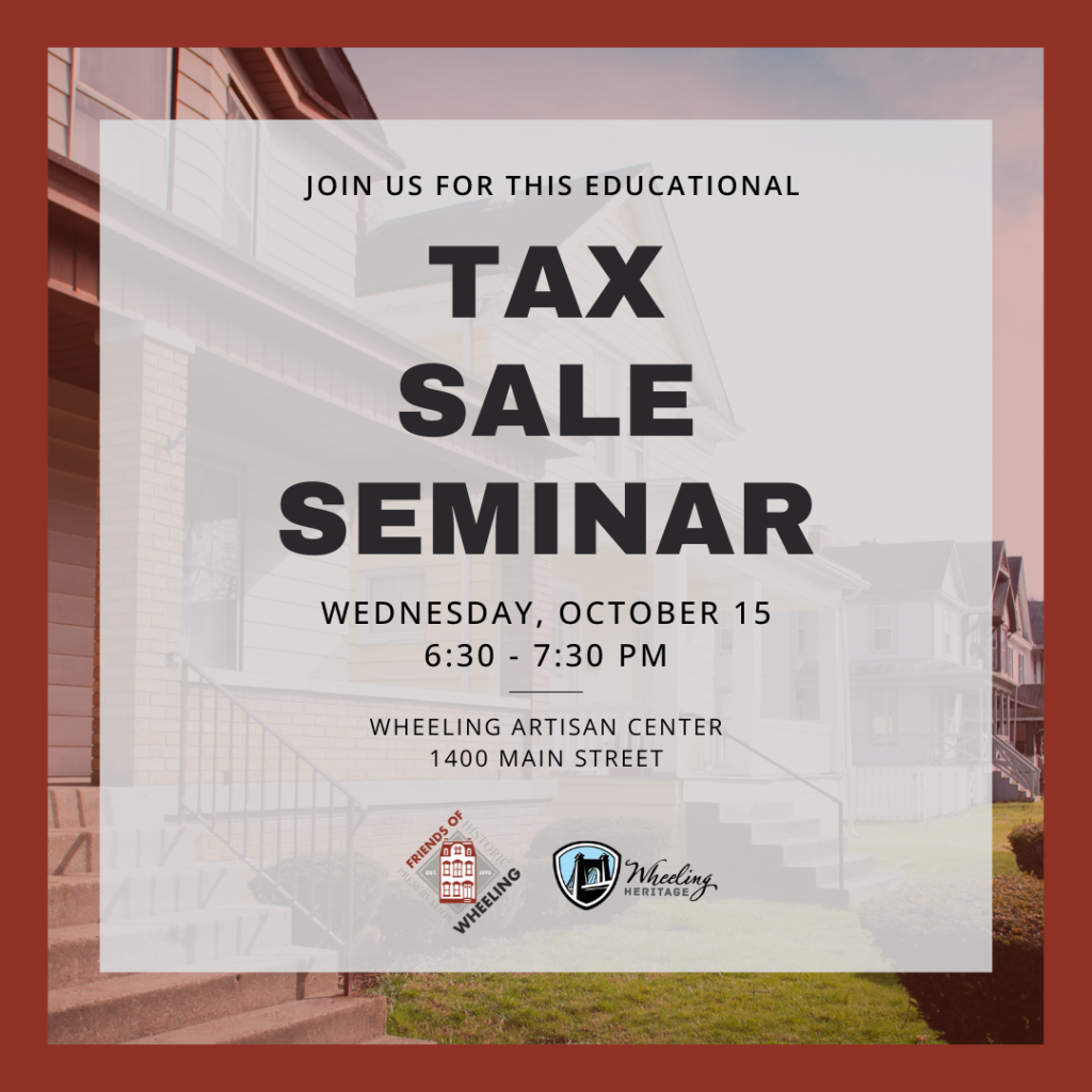 Friends of Wheeling and Wheeling Heritage are hosting a Tax Sale Seminar, beginning at 6:30 pm on Wednesday, October 15, at the Wheeling Artisan Center, 1400 Main Street. Attendees will include WV State Senator Ryan Weld, along with some local residents who have personal experience with these tax sales. All are welcome to attend.
